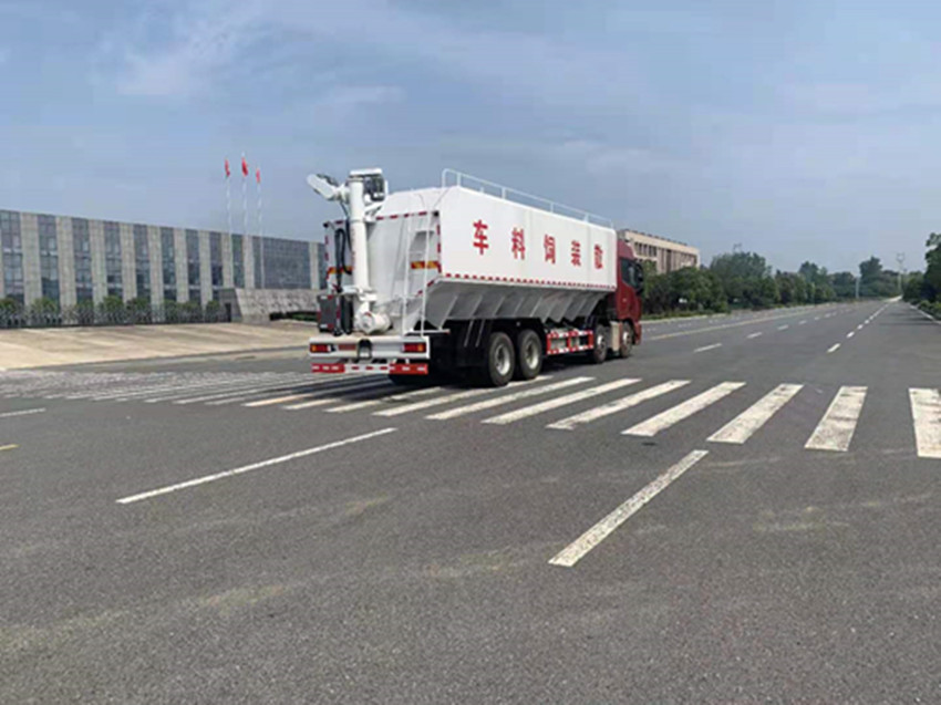 散裝飼料運輸車,散裝飼料車的飼料罐架設在卡車的底盤上,罐頂開有進料口.頂部的一根螺旋輸送卸料管(俗稱卸料絞龍)則可自由回轉和抬升,抬升的仰角可達60度。運輸時,頂部的螺旋管平臥在罐頂;卸料時則抬起,使管端的出料口與畜禽飼養(yǎng)場貯料罐頂部的進料門相接,駕駛室內裝有操縱裝置(操縱裝置也可裝置在罐體尾部),卸料時通過車底的動力輸出軸和減速器來驅動螺旋,以完成卸料。